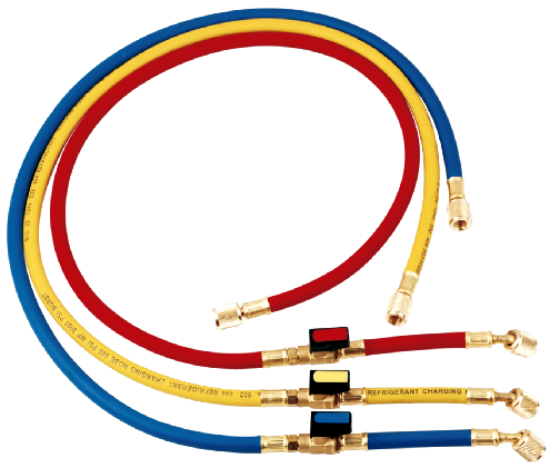 | Шланги заправочні з вентилем HS-360-BV | R22 R134a R404A R407c R502 | 3000 psi | 150см | 1/4-1/4SAE(45°) |